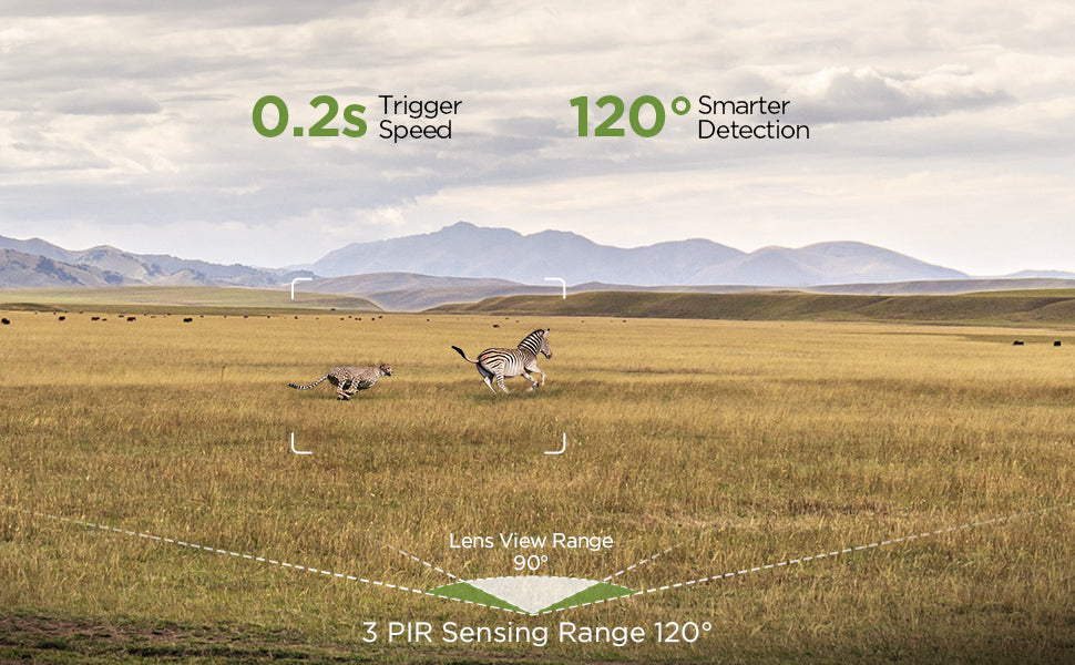 Equipped with 3 PIR sensors, this wifi trail camera brings 120° detection angle, which makes the motion detection faster and more accurate. With 0.2s trigger speed, you won't miss any exciting moments in the wildlife world.