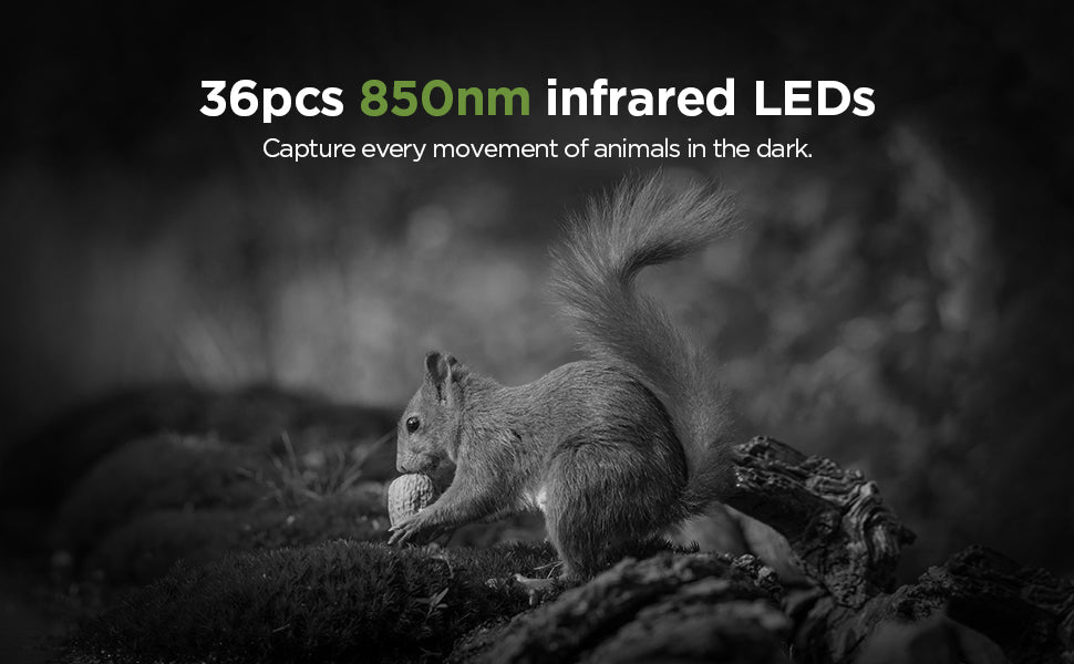The trail camera will automatically switch to night mode once it detects dim light. 36pcs IR LEDs help to capture close-up details of the animals in pitch darkness.