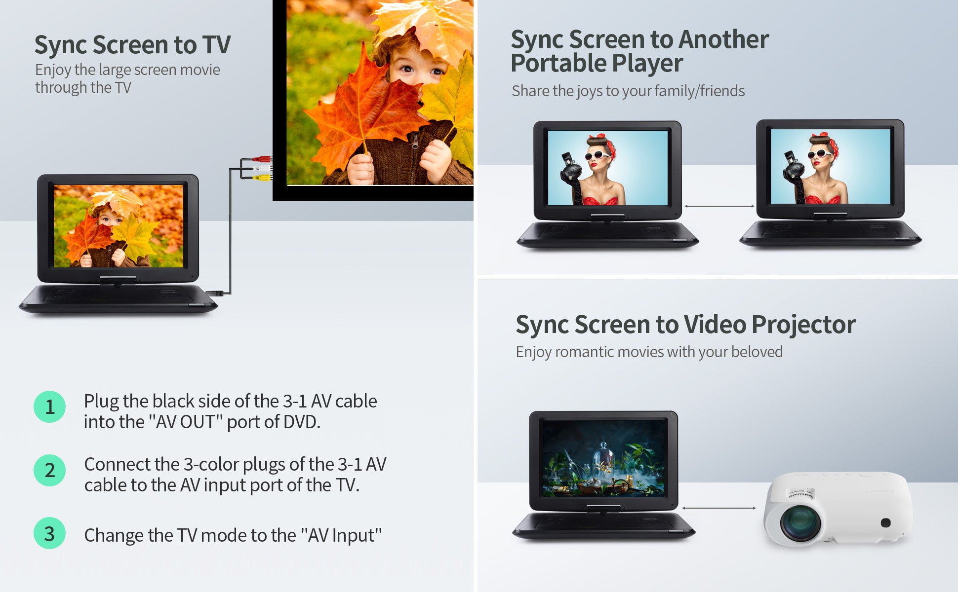 【Sync Screen to TV】Want a larger screen? YOTON YD155 portable DVD player can connect with your TV, projector or another portable DVD player to create a private theater easily and bring happiness to you and your family.